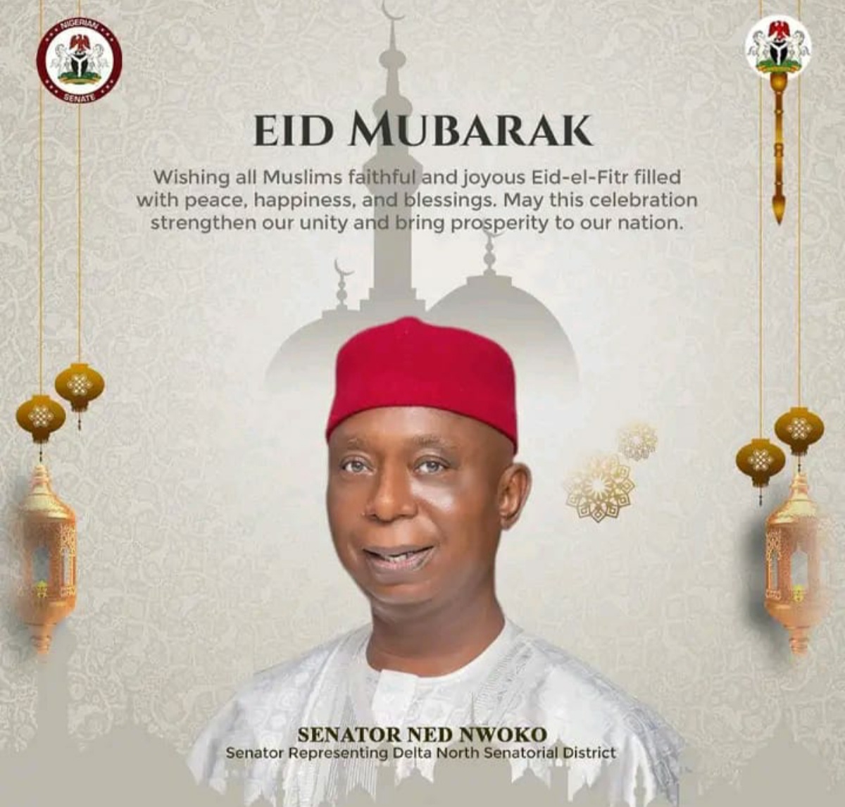 Sen. Ned Nwoko (APC-Delta) has called on the Muslim faithful and all Nigerians to continue to pray for peace, security and development of the nation as Muslims celebrate the Eid-el-Fitr.